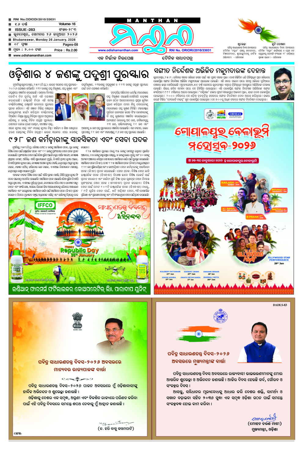 E-Paper 26-1-2025 MANTHAN January 26, 2026 Spread the love 1_compressedDownload About the Author MANTHAN Administrator "ମନ୍ଥନ" ଏକ ନିର୍ଭୀକ ଓ ନିରପେକ୍ଷ ଦୈନିକ ଓଡ଼ିଆ ସମ୍ବାଦ ପତ୍ରର ଡିଜିଟାଲ ତଥା ୱେବ୍ ସାଇଟ୍ ଅଟେ ଏଥିରେ ଆପଣ ଦୈନିକ ସମ୍ବାଦ ପତ୍ରର ପିଡିଏଫ୍ ପାଇ ପାରିବେ। Visit Website View All Posts Post Views: 10 Post navigation Previous: 24-1-2025Next: ଓଡ଼ିଶା ରାଜ୍ୟସଭା ନିର୍ବାଚନରେ ନୂଆ ସମୀକରଣ: ଚର୍ଚ୍ଚାର କେନ୍ଦ୍ରବିନ୍ଦୁରେ ଡ଼ା. ପବିତ୍ର ମୋହନ ସାମନ୍ତରାୟ Leave a Reply Cancel replyYour email address will not be published. Required fields are marked *Comment * Name * Email * Website Save my name, email, and website in this browser for the next time I comment. Related Stories E-Paper 5-2-2026 MANTHAN February 5, 2026 0 E-Paper 4-2-2026 MANTHAN February 4, 2026 0 E-Paper 3-1-2026 MANTHAN February 3, 2026 0