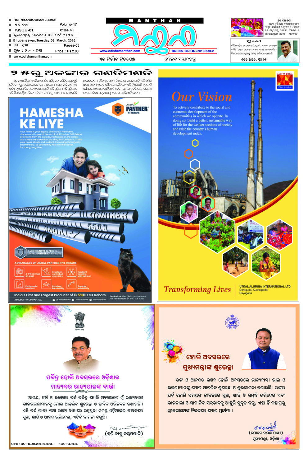 E-Paper 3-3-2026 MANTHAN March 3, 2026 Spread the love 1_compressedDownload About the Author MANTHAN Administrator "ମନ୍ଥନ" ଏକ ନିର୍ଭୀକ ଓ ନିରପେକ୍ଷ ଦୈନିକ ଓଡ଼ିଆ ସମ୍ବାଦ ପତ୍ରର ଡିଜିଟାଲ ତଥା ୱେବ୍ ସାଇଟ୍ ଅଟେ ଏଥିରେ ଆପଣ ଦୈନିକ ସମ୍ବାଦ ପତ୍ରର ପିଡିଏଫ୍ ପାଇ ପାରିବେ। Visit Website View All Posts Post Views: 1 Post navigation Previous: ବ୍ରହ୍ମପୁର ଫର୍ମାସିଟିକାଲ ୱାର୍କସ ୟୁନିଅନର ବାର୍ଷିକ ସମ୍ମିଳନୀ Leave a Reply Cancel replyYour email address will not be published. Required fields are marked *Comment * Name * Email * Website Save my name, email, and website in this browser for the next time I comment. Related Stories E-Paper 2-3-2026 MANTHAN March 2, 2026 0 E-Paper 27-2-2026 MANTHAN February 27, 2026 0 E-Paper 26-2-2026 MANTHAN February 26, 2026 0
