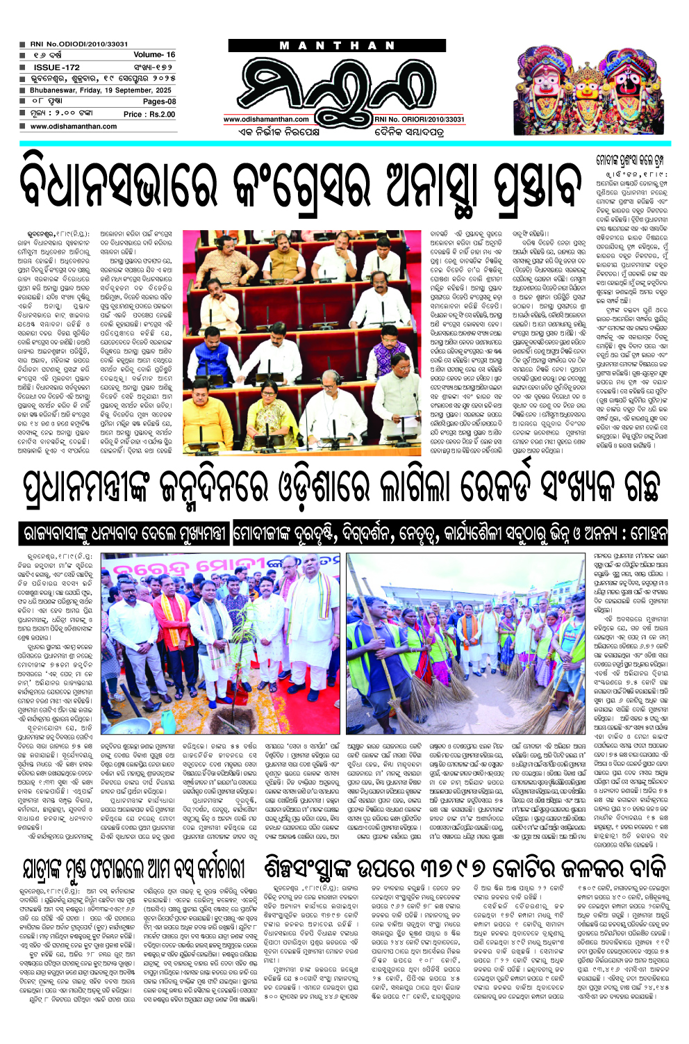 Spread the love 1_compressedDownload Post Views: 81 Post navigation Previous ଦିବ୍ୟାଙ୍ଗଙ୍କୁ ସମ୍ମାନ ଜଣାଇ ମୋଦୀଙ୍କ ଜନ୍ମ ଦିନରେ ବୃକ୍ଷରୋପଣNext 20.9.2025 Leave a Reply Cancel replyYour email address will not be published. Required fields are marked *Comment * Name * Email * Website Save my name, email, and website in this browser for the next time I comment. More Stories E-Paper 11-10-2025 October 11, 2025 MANTHAN E-Paper 10-10-2025 October 10, 2025 MANTHAN E-Paper 9-10-2025 October 9, 2025 MANTHAN